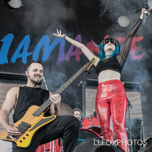 If you weren’t at the packed Ruoff Home Mortgage Music Center Tuesday night, you missed one helluva show! It was a night of solid, intense, hard rock with lots of attitude, killer riffs, exceptional musicianship, and some pyro thrown in for good measure. Diamante, the 22-year-old vocalist from Boston, was the first act of the night. She strode onto the stage wearing wickedly studded sunglasses and hat, her sapphire hair glowing in the stage lights. Opening with Bite My Kiss, she rocked a six-song set with confidence and swagger way beyond her years. Her stage presence, along with her amazing vocals, make Diamante an artist to keep your eyes – and ears – on.